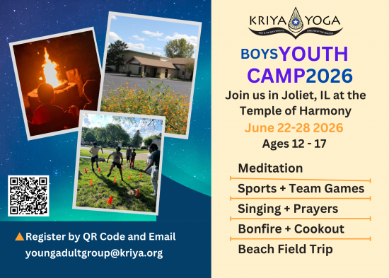 We are excited to announce our annual boys camp (ages 12-17) held at the Temple of Harmony (Kriya Vedanta Gurukulam) in Joliet, Illinois. This camp will have a minimum fee of 150 dollars.