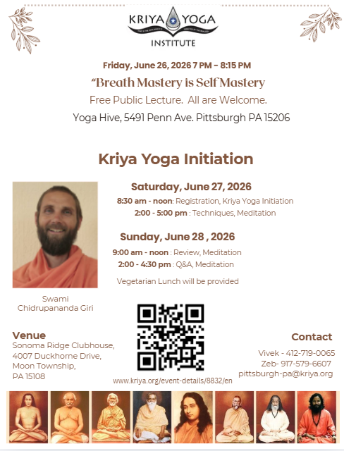 Saturday & Sunday program is limited to those getting initiated at this event as well as to those already initiated into Kriya Yoga in the lineage of Paramahamsa Hariharananda and Paramahamsa Prajnanananda.