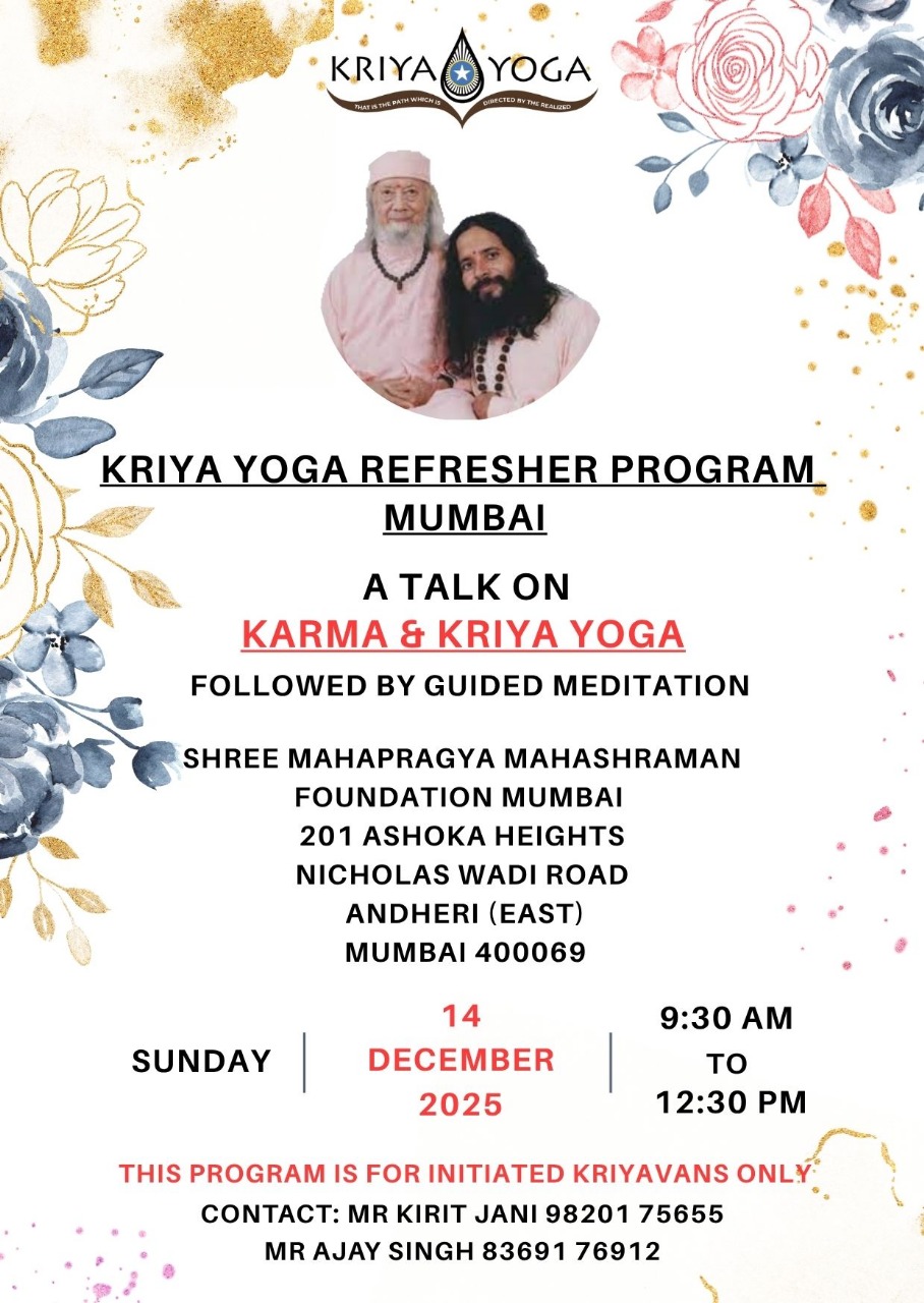 (Only for initiated kriyavans)14 Dec.2025, 9:30 am to 12:30 pmSunday9:30 am : Satsang on Karma & Kriya Yoga10.15 am : Question & Answer Session11:00 am : Guided Meditation